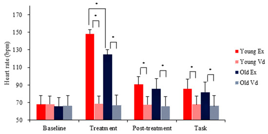 Fluctuations in heart rate (HR) as a function of Condition and Time. Young Ex: Exercise condition in young adults. Young Vd: Video-watching condition in young adults. Old Ex: Exercise condition in older adults. Old Vd: Bideo-watching condition in older adults. * p < 0.05.