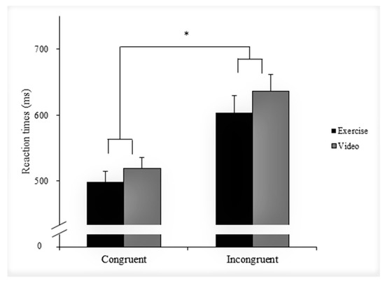 On the other hand, decomposition of the Condition × Congruency interaction showed that RT was shorter following exercise than following video-watching during the congruent (Exercise: 498.4 ms; Video: 519.1 ms; F(1, 42) = 29.7, η2p = 0.37, p < 0.001) and incongruent trials (Exercise: 604.2 ms; Video: 635.8 ms; F(1, 42) = 21.6, η2p = 0.34, p < 0.001). Results also indicated that RT was shorter during the congruent trials compared with that during incongruent trials in both the exercise (Congruent: 498.4 ms; Incongruent: 604.2 ms; F(1, 42) = 10.7, η2p = 0.20, p = 0.002) and video condition (Congruent: 519.1 ms; Incongruent: 635.8 ms; F(1, 42) = 15.1, η2p = 0.26, p < 0.001), with the former revealing a smaller congruency effect. Figure 5 depicts RT during the Stroop test in the exercise and video condition.