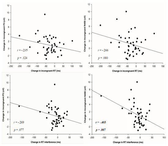 Based on the results of ANCOVAs, data on change in incongruent RT, change in RT interference, change in incongruent P3 amplitude, and change in incongruent N450 amplitude were selected for bivariate correlation analyses. Results only found significant correlations between changes in RT interference and changes in incongruent N450 amplitude (r = −0.403, p = 0.007). There were no significant correlations between the other measures (e.g., incongruent condition RT and incongruent P3, incongruent RT and incongruent N450, RT interference and incongruent P3). Figure 6 depicts these correlations.