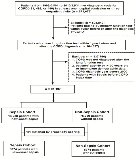 This study has several strengths. Spirometry is crucial and the most objective diagnostic tool used to diagnose COPD [13]. In order to ensure the accuracy of the diagnosis of COPD, we only enrolled patients who received a pulmonary function test within one year before and after the COPD diagnosis was made. Patients were also excluded if the COPD diagnosis was altered after the pulmonary test. The 2016 Surviving Sepsis Campaign (SSC) guidelines and the published 3rd International Consensus Definitions for sepsis and septic shock (Sepsis-3) revised definitions of sepsis emphasize organ dysfunction related to a dysregulated host response to infection [5,14]. Although the Sequential Organ Failure Assessment (SOFA) or quick SOFA (qSOFA) score is currently the most commonly used scoring system, the most appropriate scoring system to assess organ dysfunction is controversial [14,15,16]. In this study, we defined sepsis according to ICD-9-CM codes including all infections with related acute organ dysfunction as validated in a previous study [17]. These selection criteria were more comprehensive and similar to a modern definition of sepsis. We also performed propensity score matching to minimize the effects of possible confounding variables, and therefore we believe our findings are more representative and generalized.