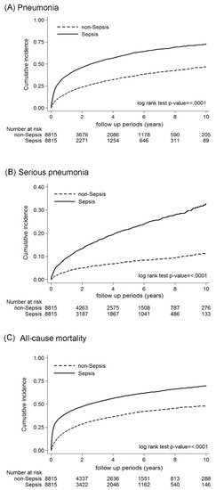 Kaplan-Meier analysis of the cumulative incidence for (A) pneumonia, (B) serious pneumonia and (C) mortality between the sepsis and non-sepsis cohort after matching.