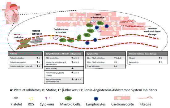Immunomopharmacology of commonly used post-MI and heart failure drugs. The immune system is involved in all post-MI processes, including platelet activation immediately after vessel occlusion, early immune activation leading to leukocyte extravasation into the heart, and immune-mediated tissue damage. Currently used post-MI drugs with immunomodulatory effects include platelet inhibitors (A), statins (B), beta-blockers (C), and drugs targeting the renin–angiotensin–aldosterone system (D), including angiotensin converting enzyme (ACE) inhibitors, angiotensin receptor blockers, angiotensin receptor–neprilysin inhibitors and aldosterone antagonists. DAMPs; danger associated molecular patterns, ROS; reactive oxygen species, MMP; metalloproteinase. ↓ decrease, ↑ increase.