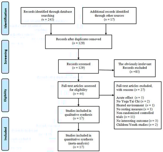 Two-hundred and sixty-two records were retrieved from five electronic databases and other sources. After duplicates were removed, 129 documents were further assessed based on the titles and abstracts of articles, leading to 85 irrelevant articles excluded. Based on the pre-determined inclusion criteria, we performed full-text article assessment. Of 44 full-text articles, 27 were excluded because researchers investigated the acute effects of mind–body exercise (n = 5), no Tai Chi/Yoga was implemented as the primary intervention (n = 2), Yoga training took place at a heated environment (n = 1), non-randomized controlled trials were used (n = 11), outcome of interest was not reported (n = 3), children or youth were included as study participants (n = 2), and resting measure of HRV was not performed (n = 3). Therefore, we included 17 RCTs in this review [,,,,,,,,,,,,,,,]. The process of study selection is presented in Figure 1.