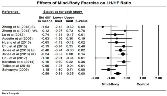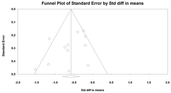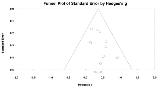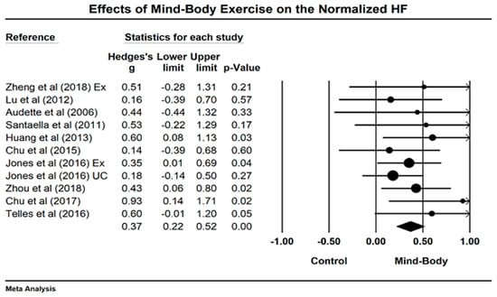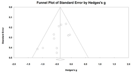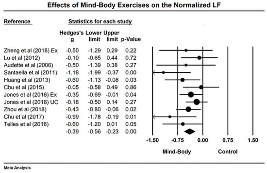 We meta-analyzed the data (12 studies including 14 comparisons) regarding the effects of mind–body exercises on the nLF (greater negative value indicating better sympathetic and vagal modulation). The funnel plot is visually asymmetrical because three outlying comparisons (values of Hedge’s are close to −2) [,,], with Egger’s regression intercept = −3.04, p = 0.028. After removing three outliers, the funnel plot (Egger’s regression intercept = −1.73, p = 0.07) is symmetrically observed in Figure 2. The study results of remaining studies indicate that mind–body exercises significantly decreased the nLF, as compared to other control groups (Hedge’s g =−0.39, 95% CI −0.39 to −0.56, p < 0.001, I2 = 11.62%, Q test = 11.62; Figure 3).