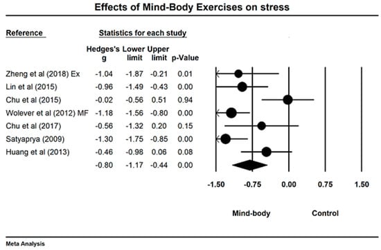We meta-analyzed the data for stress (7 studies with 9 comparisons). Following the sensitivity analysis for stress-related studies, we removed two outlying comparisons [,], the study results of meta-analysis indicate that mind–body exercises significantly reduced stress level (Hedge’s g = −0.80, 95% CI −1.17 to −0.44, p < 0.001, I2 = 68.54%; Figure 8).