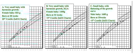 The different “small babies”: Growth curve of small, small for gestational age (SGA), intrauterine growth restricted (IUGR) babies (Y axis: weight and reference curves; X axis: gestational weeks). Legend: (A) is a very small, early preterm normal for gestational age child; (B) is a very small, early preterm, SGA but harmoniously grown, preterm child (mother and father also of small body size); child (C) is a small, SGA, preterm child with a flattening of the growth curve. Although (B,C) are identified also as IUGR, flattening of the growth curve may have a different (unfavorable) meaning as for life-long complications. (Courtesy of R. Attini and P. Gaiotti).