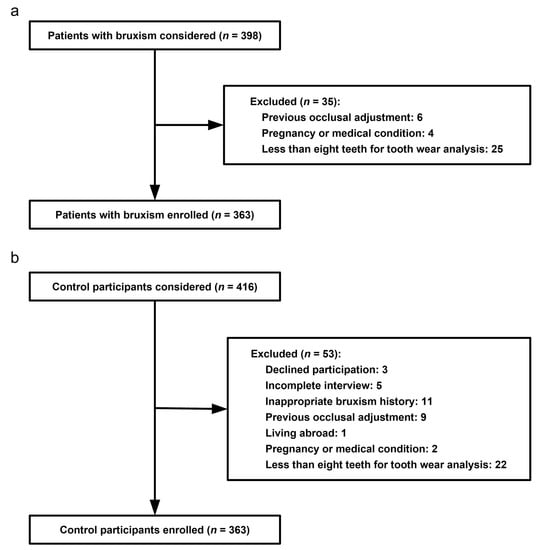 Of the 398 consecutive bruxism patients initially considered for the present study, 35 patients (8.8%) were excluded. We finally recruited 363 bruxism patients (91.2%). Details of case patient enrollment are described in Figure 1a. Among the 416 control subjects invited to participate, 53 (12.7%) were excluded. The remaining 363 participants (87.3%) were recruited as control participants. Details of control subject enrollment are described in Figure 1b.