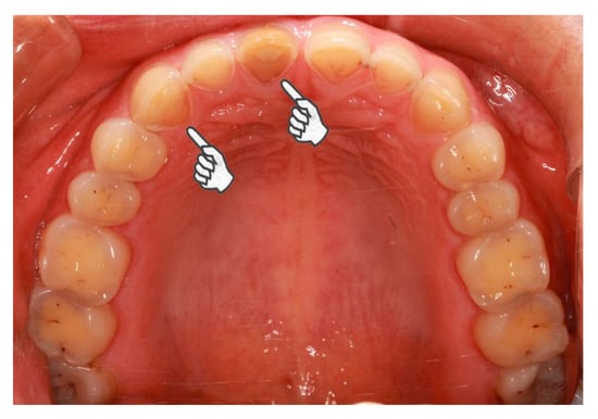 Pathological tooth wear of a 23-year-old female case participant. In general, the female is healthy but she suffers from daily regurgitation and/or heartburn for about two years. She complained of teeth grinding during sleep every day. She rarely experiences exposure to acids from the environment or diet. She hardly rinses or brushes after regurgitation. Extensive tooth wear into dentin was identified, especially on the palatal superficies of upper incisors and canines (pointers).