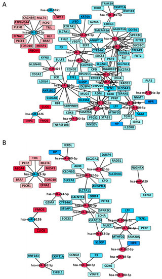 MiRNA–mRNA interactive network in EGFR-mutant lung adenocarcinoma. (A) Network of 149 miRNA-mRNA interactions in EGFR-mutated lung adenocarcinoma; (B) Network of 63 statistically significant miRNA–mRNA interactions in EGFR-mutated lung adenocarcinoma (p < 0.01). Circles and squares represent miRNAs and mRNAs, respectively. Red indicates an upregulated miRNA or mRNA, whereas blue indicates a downregulated miRNA or mRNA. A line indicates an miRNA–mRNA interaction. The color intensity is proportional to the fold change (continuous) of EGFR-mutated/wild-type lung adenocarcinoma.
