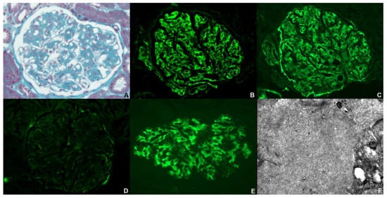 - Bridoux, F.; Hugue, V.; Coldefy, O.; Goujon, J.M.; Baumens, M.; Sechet, A.; Preud’Homme, J.L.; Touchard, G. Fibrillary glomerulonephritis and immunotactoid (microtubular) glomerulopathy are associated with distinct immunologic features. Kidney Int. 2002, 62, 1764–1775. [Google Scholar] [CrossRef] [PubMed]