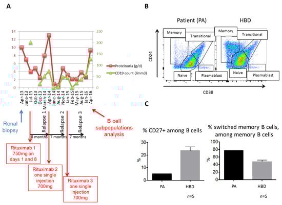 - Colucci, M.; Carsetti, R.; Cascioli, S.; Casiraghi, F.; Perna, A.; Ravà, L.; Ruggiero, B.; Emma, F.; Vivarelli, M. B Cell Reconstitution after Rituximab Treatment in Idiopathic Nephrotic Syndrome. J. Am. Soc. Nephrol. 2016, 27, 1811–1822. [Google Scholar] [CrossRef] [PubMed]