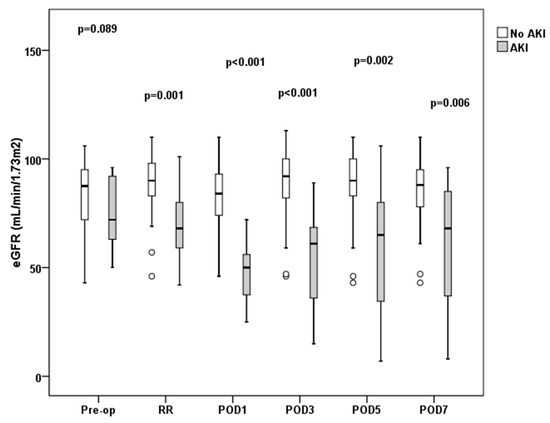 Estimated glomerular filtration rate (eGFR) at predefined time-points. Open boxes represent non-AKI patients, shaded boxes AKI patients. Boxes and whiskers show interquartile ranges and total observed ranges, respectively. eGFR: estimated Glomerular Filtration Rate; Pre-op: preoperatively; RR: recovery room; POD1: postoperative day 1; POD3: postoperative day 3; POD5: postoperative day 5; POD7: postoperative day 7.