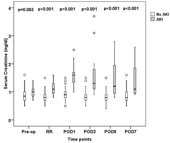 Serum creatinine measurements at predefined time-points. Open boxes represent non-AKI patients, shaded boxes AKI patients. Boxes and whiskers show interquartile ranges and total observed ranges, respectively. Pre-op: preoperatively; RR: recovery room; POD1: postoperative day 1; POD3: postoperative day 3; POD5: postoperative day 5; POD7: postoperative day 7.