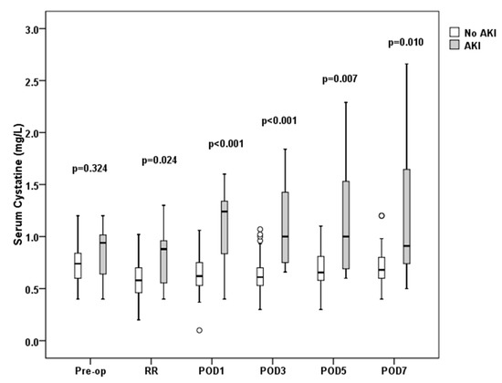 Serum cystatin C measurements at predefined time-points. Open boxes represent non-AKI patients, shaded boxes AKI patients. Boxes and whiskers show interquartile ranges and total observed ranges, respectively. Pre-op: preoperatively; RR: recovery room; POD1: postoperative day 1; POD3: postoperative day 3; POD5: postoperative day 5; POD7: postoperative day 7.