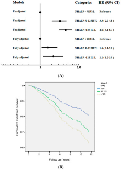 (A) Unadjusted and fully adjusted HR of progression of VFs across different categories of NHALP in 516 patients with RA during 4489 person-years of follow-up (Fully adjusted: age, gender, osteoporosis, NHALP, hs-CRP and ESR). The lowest HR group (NHALP < 90 IU/L) served as the reference group. Patients with higher NHALP (>125 IU/L) had the greatest risk of progression of VFs after full adjustments. (B) Cumulative survival curves with respect to different categories of NHALP after fully adjusted in the Cox proportional hazards regression model.