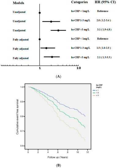 Figure 2A illustrated the HR and 95% CI for progression of VFs among study patients with different categories of hs-CRP, considering the lowest HR group (hs-CRP < 1 mg/L) as reference. Both unadjusted and multivariable-adjusted results demonstrated a robust increase in the HR among patients with higher hs-CRP after fully adjusted for age, gender, osteoporosis, hs-CRP, NHALP and ESR. Higher hs-CRP levels were associated with an increase in the aHR: 2.1 (95% CI: 1.3–3.3) for the category of hs-CRP > 3 mg/dL. Figure 2B showed cumulative survival curves with respect to different categories of hs-CRP after fully adjusted in the Cox regression model.