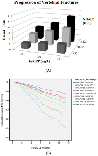 Rheumatoid arthritis (RA) has been recognized as the most prevalent inflammatory arthritis worldwide [1]. An incremental increase in risk of vertebral fractures (VFs) in patients with RA has been identified by a myriad of observational studies and meta-analyses [2,3,4,5,6,7,8,9]. Vertebral fracture (VF) is a highly prevalent type of fragility fracture and associated with impaired activities of daily living, reduced pulmonary functions, cardiovascular diseases and increased mortality [10,11,12,13]. Given that less than one-third of VFs are clinically recognized at the event occurrence time and require spine imaging to be diagnosed, the epidemiology of VFs differs from osteoporotic fractures at other skeletal sites [14]. In Taiwan, the average medical cost of fracture per case is more than NT $100,000 (roughly US$3300) for acute care and consumes enormous amounts of national health expenditures [15] In the United States, the medical expenditure for VFs is more than $1 billion annually. Thus identifying useful biomarkers as early warning signs of VFs for risk stratification in RA patients is warranted. Close monitoring of serum concentrations of alkaline phosphatase (ALP) is recommended in the management of chronic kidney disease-mineral and bone disorder (CKD-MBD) [16]. Since ALP isoenzymes are mainly derived from bones and liver, raised serum concentrations of non-hepatic ALP (NHALP) reflect bone pathology [17]. Moreover, C-reactive protein (CRP) is the first-choice biomarker for RA assessment in hospital practice and high sensitivity CRP (hs-CRP) predicts VFs in the elderly population [18,19]. In light of this, we aimed to investigate the increase in serum concentrations of NHALP and hs-CRP reflects the increased risk of VF progression in RA patients. The modification effect between NHALP and hs-CRP on progression of VF was also investigated in this population-based study with relatively long follow-up.
