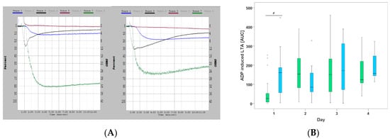 (A) Representative original recordings of aggregation curves in a patient on cangrelor treatment (left) and another patient on oral P2Y12-inhibitor treatment (right) Platelet activating compounds: collagen (blue), adenosine diphosphate (ADP) [black], arachidonic acid [red], and thrombin receptor activator peptide (green). (B) Median ADP AUC for the first 4 days showing significant difference on day 1. CANGRELOR (green) vs. ORAL-P2Y12 (blue).
