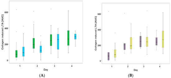 The effect of aspirin was not different between the two groups (70.3 (31.9–141.1) for CANGRELOR vs. 93.1 (46.7–195.6) for ORAL P2Y12) on day 1 (p = 0.595) but revealed significantly higher collagen AUC values (less inhibitory effect) on day 3 (242.3 (176.8–323.7) vs. 256.7 (130–352.2)) and day 4 (260.4 (167.8–356.5) vs. 291.6 (258.5–330.0)) in both groups (CANGRELOR p < 0.001 and ORAL P2Y12 p < 0.05) (Figure 2A).