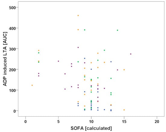 Correlation of SOFA score with ADP-AUC. Data of the 25 patients of the CANGRELOR group is shown. Day 1 (blue), day 2 (green), day 3 (orange), and day 4 (purple) had no differences. Overall data showed r = −0.076; p = 0.623).