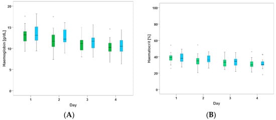 (A) Median haemoglobin for the first 4 days after index event. CANGRELOR (green) vs. ORAL-P2Y12 (blue); (B) Median haematocrit for the first 4 days after index event. CANGRELOR (green) vs. ORAL-P2Y12 (blue).