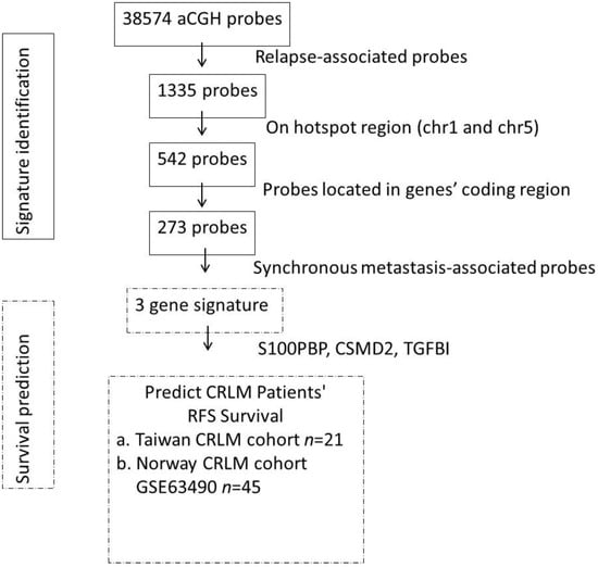 To identify new molecular and genetic signatures specific to CRCLM patients, we conducted DNA copy number profiling on a cohort of 21 Taiwanese CRCLM patients by a comparative genomic hybridization (CGH) array. We identified a three-gene signature associated with cancer recurrence which was prognostic for relapse-free survival in our cohort. We externally validated this signature in a public cohort of 45 patients after hepatectomy for CRCLM. Herein, we identify a three-gene signature that is prognostic for relapse-free survival and present the validation results of this signature in an independent cohort.