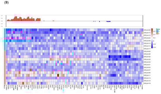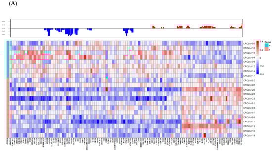 Through a series of statistical analyses to combine information from copy number alterations, cancer recurrence, and synchronous metastasis status, a gene signature was obtained. We identified the genes involved in the colorectal cancer metastasis signaling pathway, such as CTNNB1, WNT, JAK, and AKT (Figure S2). Figure 2 outlines the gene selection and data analysis procedures we performed. First, we compared the CNA profiles between 13 relapsed and 8 non-relapsed patients and found 1335 probes with significant differences. These 1335 relapse-associated probes were used for further statistical analyses. We inspected the distribution of relapse-associated probe regions on each chromosome. The results are shown in Table S1 along with the total number of gene-harboring probes, the frequency and density of t-test-significant probes, as well as the results of Fisher′s exact test. Two hotspot regions were enriched on chromosome 1 and chromosome 5 (Table S1). In the corresponding hotspot regions in Figure S1, we identified 542 probes in relapse-association hotspots (chr1 and chr5) and found 273 probes located in gene regions. Synchronous liver metastases are found in around 25% of patients at the time of colorectal cancer diagnosis, which is limited to the liver in 30% of patients [26]. We focused on two clinical variables—recurrence states (yes vs no) and synchronous metastasis (yes vs no)—and we used Students′ t-test to identify the probes with differential CNAs between patients with different statuses of two clinical variables: recurrence states (yes vs no) and synchronous metastasis (yes vs no). The t-test-significant probes are presented by the density bar shown in the circos plot (Figure 3). We also determined that chromosome 20 had significant amination and chromosome 18 had significant depletion in metastasized colorectal cancer. Chromosome 20 amplification has been demonstrated in colorectal cancers with liver metastasis [27,28] and loss of heterozygosity in the 18q region has been found in colorectal cancer [29]. To investigate the recurrence-associated candidate genes of CRCLM, we started from the enriched chromosomes of the recurrence-associated probe blocks. There were 542 recurrence-associated probes on chr1 and chr5. We further selected those probe blocks that were also associated with synchronous metastasis, and a final set of three genes (S100PBP, CSMD2, and TGFBI) were obtained. The heatmap for the correlations between gene copy number variation and patients′ recurrence status on chromosome 1 and 5 showed that most probes were associated with a loss of copy number in the recurrence group (Figure 4).