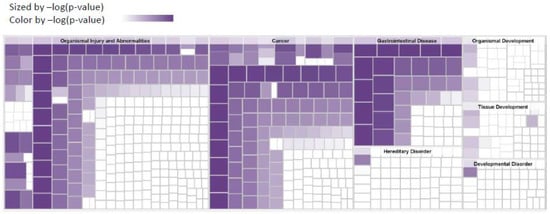 We use the IPA for diseases and biological functions to conduct a functional enrichment analysis of synchronous metastasis-associated genes. The results show that our genes were enriched in cancer (p = 1.24 × 10−9), gastrointestinal disease (p = 1.24 × 10−9), and hepatic systems disease (p = 5.27 × 10−9) (Figure 5). The most significant disease and disordered biological functions associated with synchronous metastasis genes were related to cancer, organismal injury, and gastrointestinal disease. We found that the top four significant diseases were associated with CRCLM (Table 2).
