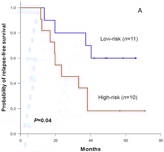 The genome-wide CNA profiles for 21 patients with colorectal liver metastases are shown in Figure 1. Frequency plots (Figure 1) indicate that recurrence-associated regions were enriched on chromosome 1 and chromosome 5 (Fisher’s exact probability test; p = 1.76 × 10−17, 4.32 × 10−34, respectively, Table S1). In addition, we focused on regions significantly correlated with synchronous liver metastasis and identified three synchronous metastasis-associated genes in the relapse-associated hotspot regions chr1 and chr5.