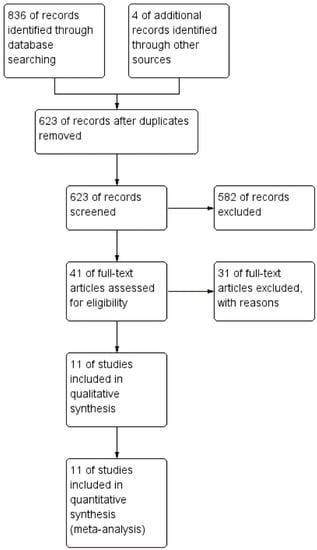 Using the strategy presented, our initial search yielded 836 records. A further four records were acquired through reference lists of relevant publications. After removal of duplicates, 623 references were screened through titles and abstracts resulting in 40 records, which were scheduled for full-text reading. In the end, we identified 11 studies that were eligible for inclusion and data extraction, covering 358 patients in the TaTME group and 420 patients in the laparoscopic group (778 patients in total). A PRISMA flowchart presented in Figure 1 summarizes the process used to obtain these studies. Baseline information on included studies is presented in Table 1. The quality of references, according to Newcastle-Ottawa Scale (NOS), is high.