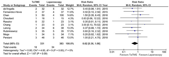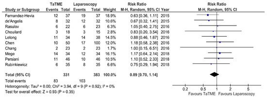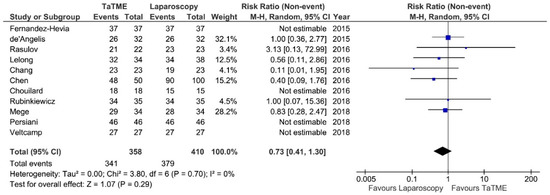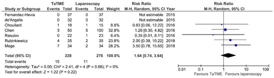 Intraoperative adverse effects (IAE) were reported in seven studies. Meta-analysis showed no statistically significant differences between analyzed groups: 15/228 (6.57%) in TaTME vs. 11/276 (3.98%) in Laparoscopy group: RR = 1.64; 95% CI 0.74–3.64; p = 0.22 (Figure 4). There was no heterogeneity among studies, I2 = 0%.