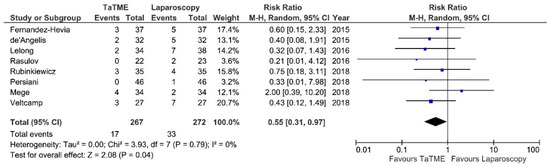 Post-operative morbidity was reported in 10 studies. Meta-analysis revealed no statistically significant differences between analyzed groups: 83/331 (25%) in TaTME vs. 103/383 (27%) in Laparoscopy group: RR = 0.89; 95% CI 0.7–1.14; p = 0.35 (Figure 2). There was no heterogeneity among studies, I2 = 0%. Major complications (Clavien Dindo ≥3) were present in eight studies [24]. Meta-analysis revealed a statistically significant difference in favor of TaTME: 17/267 (6.36%) vs. 33/272 (12.13%): RR = 0.55; 95% CI 0.31–0.97; p = 0.04 (Figure 3). There was no heterogeneity among analyzed studies, I2 = 0%.