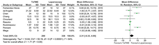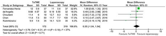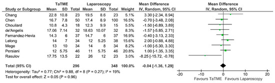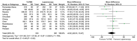 Operative time was reported by 11 authors. There were no significant differences between groups, however Fernandez-Hevia et al., De’Angelis, Rubinkiewicz et al. and Lelong et al. showed shorter duration of TaTME in comparison to laparoscopy: MD = −4,52; 95% CI −22.51–13.57; p = 0.62 (Figure 5). Only Fernandez-Hevia et al. report a two-team approach as standard; Chen, Rasulov et al., Persiani et al. and Veltcamp et al. used both a one- and two-team approach in their material. De’Angelis et al., Chang et al., Rubinkiewicz et al. and Mege et al. use a one-team approach. Lelong et al. and Chouilard et al. did not include information about the technique used. The heterogeneity between studies was significant, I2 = 76%.