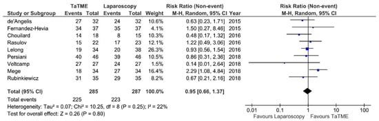 Completeness of mesorectal excision was reported in 9 studies. There were no significant differences between analysed groups: RR = 0.95; 95% CI 0.66–1.37; p = 0.80 (Figure 7). The heterogeneity of studies was moderate, I2 = 22%. All authors who report the quality of mesorectal excision used the Quirke classification with the exception of Fernandez-Hevia et al. and Mege et al., who did not state the protocol they used.