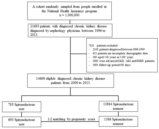 From 1996 to 2013, we identified 21,693 patients with CKD who were defined as having at least one record of a CKD diagnostic code made by a nephrologist per month for at least three consecutive months. We used a 4-year look-back (1996–1999) period to determine patients with incident CKD by excluding pre-existing CKD diagnosis. In addition, incident CKD patients who had incomplete demographic data; were aged <18 years, >100 years; had advanced CKD (stage 5), acute kidney injury, end-stage renal disease; or had a follow-up time of <90 days were also excluded. The remaining incident CKD patients represented moderate to severe (stage 3–4) CKD patients. Among them, patients who had received spironolactone within 90 days after CKD diagnosis were considered as spironolactone users, whereas the remaining patients were considered as non-users. Because we used drug prescription information within 90 days after CKD diagnosis to ascertain spironolactone use, the 91st day after CKD diagnosis was defined as the index date.