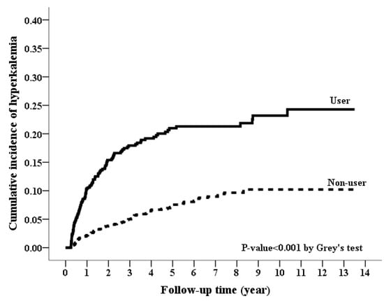 Cumulative incidence rate of hyperkalemia-associated hospitalization between spironolactone users and non-users. (p-value < 0.001, Grey’s test).