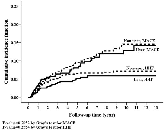 Cumulative incidence rate of hospitalization for heart failure (p-value = 0.2554, Grey’s test) and major adverse cardiovascular events (p-value = 0.7052, Grey’s test) between spironolactone users and non-users between spironolactone users and non-users.