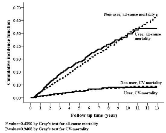 Cumulative incidence rate of all-cause mortality (p-value = 0.439, Grey’s test) and cardiovascular disease-mortality (p-value = 0.9408, Grey’s test) between spironolactone users and non-users.
