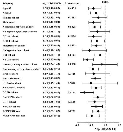 The reduced HRs of ESRD associated with spironolactone use among moderate to severe CKD patients were consistent across most of the patient subgroups, except those with female cohort, no nephrological visit, non-hypertension, DM, stroke, cirrhosis, ACEI/ARB users, while the significant interaction effect was only found between ESRD and DM (Figure 6). Moreover, the increased HRs of HKAH associated with spironolactone use were consistently significant in all the stratified subgroups (Figure 7).