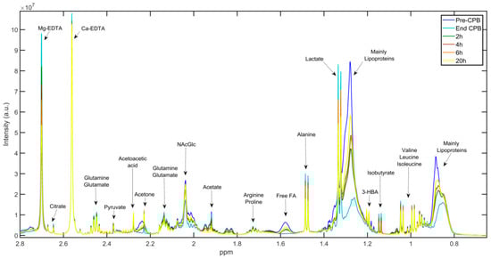 Figure 2 illustrates the aliphatic region of one-dimensional 1H-NMR spectra of median plasma samples collected before CPB (blue), at the end of CPB (cyan), 2 h post-CPB (green), 4 h post-CPB (brown), 6 h post-CPB (orange), and 20 h post-CPB (yellow). Visual inspection of spectra reveals that the intensity of several metabolites changed significantly in the peri- and postoperative period, reflecting alterations in their levels as a consequence of surgery.