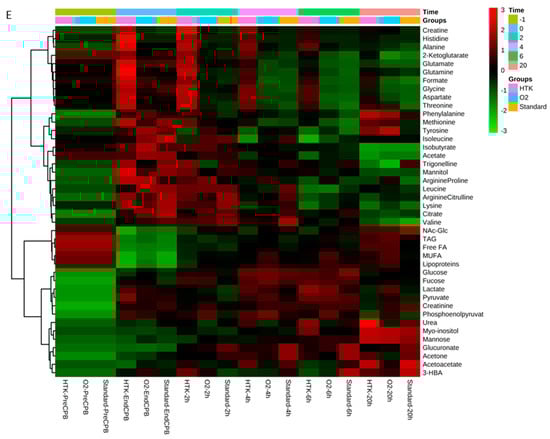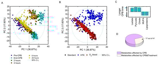 Principal component analysis revealed sample clustering according to sample time (principal component one, PC1 = 36.9%, Figure 3A) and treatment received during CPB (PC2 = 17.6%, Figure 3B). As observed in Figure 3A, samples collected before (blue) and at the end of CPB (cyan) clustered separately from each other, indicating that the ischemia-reperfusion injury itself had a significant impact on the metabolome. Longer duration of CPB resulted in greater increases of anaerobic (i.e., lactate; Pearson correlation coefficient r = 0.4, p < 0.0001) and TCA cycle (i.e., citrate; r = 0.4, p < 0.0001) metabolites, and greater dilution of plasma fatty acids and lipoproteins (r = −0.32, p < 0.0001) (Figure 3C). Samples collected 2–6 h post-CPB tended to return towards baseline, and at 20 h post-CPB samples almost reached their corresponding pre-CPB values (Figure 3A). When coloring principal component analysis scores by the intervention received, HTK patients clustered separately on the PC2 axis at the end of CPB, while patients receiving normothermic oxygenated blood overlapped with patients receiving standard CPB, indicating similar metabolite changes in the oxygenated blood and standard CPB groups. A total of 41 identified metabolites were found to contribute to sample clustering along PC1 and PC2 (Supplementary, Table S1. Overview of metabolite changes with time in each corresponding group), of which several were found to be influenced by both the surgery itself and the received treatment (Figure 3D).