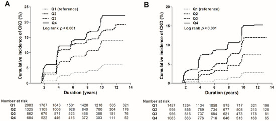 Kaplan-Meier curves for the development of eGFR <60 mL/min/1.73 m2 in female (A) and male (B) subjects.