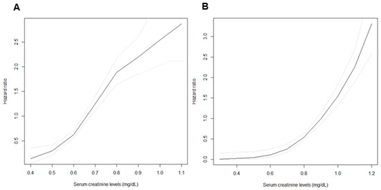 Cubic spline plots for the development of eGFR <60 mL/min/1.73 m2 according to sCr levels in female (A) and male (B) subjects. Black lines = hazard ratios, dotted lines = 95% confidence intervals.