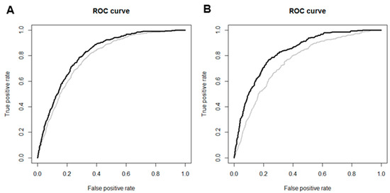 Receiver operating characteristic (ROC) curves for the development of eGFR <60 mL/min/1.73 m2 in female (A) and male (B) subjects. Areas under the curve (AUCs) were improved to 0.83 from 0.80 in female subjects and to 0.85 from 0.78 in male subjects when sCr levels were added to traditional risk factors for CKD. Gray lines represent ROC curves with traditional risk factors including age, BMI, SBP, history of HTN, DM, CVDs, hemoglobin, fasting plasma glucose, albumin, and total cholesterol. Black lines represent ROC curves with sCr levels added to traditional risk factors.