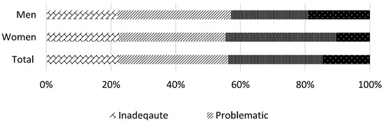 The mean age of all respondents (n = 603) was 70.9 ± 5.82 years, with men being on average older than the women (Table 1). There were significant differences in the level of education and health literacy between male and female participants. Although more of the men (36.15%) had an education level above junior high school than the women (22.74%), slightly more women had sufficient and excellent health literacy (44.62%) compared to men (42.92%) (Figure 1). Total daily calorie and protein intake were 20.25 ± 4.97 kcal/kg/day and 0.66 ± 0.19 g/kg/day, respectively (Table 1). With respect to physical activity and anthropometric measures, men were more physically active, had a faster walking speed and greater handgrip strength than women (Table 1). With regards to frailty, 4.05% and 19.32% of the men had pre-frailty and frailty respectively, compared to 1.95% and 54.72% of women. Additional descriptive statistics are shown in Table 1.