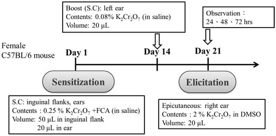PT was dissolved in 5% β-Cyclodextrin, which can improve the solubility and bioavailability of PT [25], and mice were subsequently administered PT (500 mg/kg/day) in 200 μL 5% β-Cyclodextrin by gavage for 2 weeks. Then, they were fed with the same dosage for a further 3 weeks after mice sensitization. To analyze the effects of PT on the epicutaneous test outcomes, four groups of C57BL/6 mice (A, B, C and D; n = 5/group) were used. NAC is an antioxidant that is popular due to its ability to minimize oxidative stress. In this study, we compared the effects of NAC (1200 mg/kg/day) with PT for the treatment of Cr(VI)-induced ACD. The detailed administrations are shown in Table 1. For the induction of sensitization, a modification of the coadjuvant chromium sensitization method was used, as described by van Hoogstraten et al. [26]. After a period of 2 weeks, all four of the mice groups were injected intradermally in both inguinal flanks (50 μL each) and ears (20 μL each) with either 0.25% potassium dichromate (dissolved in saline and then emulsified with an equal volume of FCA) or pyrogen-free saline (Control). Fourteen days after sensitization, we boosted mice by injecting 20 μL 0.08% potassium dichromate in saline or pyrogen-free saline (Control) into the pinna of the left ear.