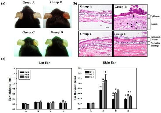 Protective effects of PT on Cr(VI)-induced ACD mice. (a) Swelling and erythema were documented by photography at 48 h. (b) H&E histology of mice ear skin after the elicitation test with Cr(VI) showed ear swelling and inflammatory cell infiltration at 72 h. In the dermis, the increased number of inflammatory cells, neutrophils, was observed (arrowhead) in K2Cr2O7 treatment (Group B). In the epidermis, Group B showed the stratum corneum thickening (bi-arrowhead), but NAC (Group C) or PT (Group D) treatment significantly suppressed Cr(VI)-induced increases in ear thickness. Also, no differences in the auricular cartilage were observed (scale bar representing 100 μM). (c) ACD reactions were quantified by measuring the ear thickness at 24, 48 and 72 h after the elicitation test (n = 5). The time course measurement of Left (vehicle) and Right (epicutaneous) ear thickness. (A: Control; B: K2Cr2O7; C: NAC; D: PT) (* p <0.05 versus control group; # p <0.05 versus K2Cr2O7 group).