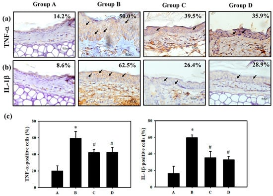 Paraffin-embedded skin tissue sections (5 μM) were dried, deparaffinized, and rehydrated. The hydrated tissue sections were steamed in citrate buffer (pH 6.0; for antigen retrieval), treated with 3% hydrogen peroxide, and blocked with a DAKO antibody diluent (DAKO Corp, Carpinteria, CA, USA) for 1 h at room temperature. The tissue sections were incubated with aliquots of antibodies (Santa Cruz Biotechnology, Santa Cruz, CA, USA) against TNF-α (1:500) and IL-1β (1:100) at 4 °C overnight. After washing, aliquots of biotinylated secondary antibodies (Biotinylated Link Universal) were added. Color development was performed using a labeled streptavidin biotin plus horseradish peroxidase kit (DAKO Corp, Carpinteria, CA, USA). Finally, the slides were counterstained using hematoxylin and examined under light microscopy.