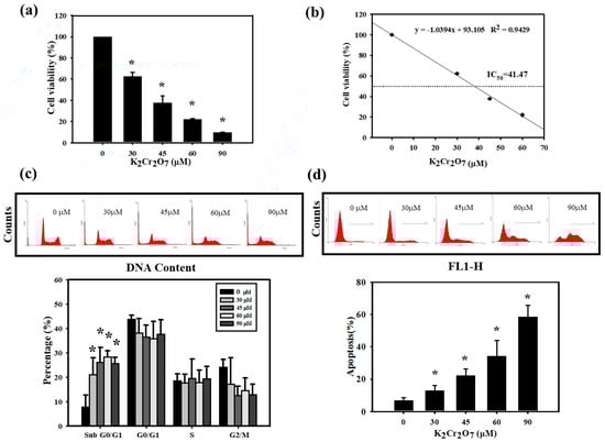 Measurement of cell viability, cell cycle distribution and apoptosis of Cr(VI) in HaCaT cells. The cells were treated with 0, 30, 45, 60 or 90 μM Cr(VI) for 24 h. (a) Cell viability was measured using the MTT assay. Cr(VI) decreased the viability of HaCaT cells in a concentration-dependent manner. (b) Determination of Cr(VI) IC50 values by linear regression. (c) Cells were collected and incubated with 50 μg/mL of PI for 30 min and subjected to flow cytometry analysis to examine the cell distribution at each phase of the cell cycle. The percentage of cells in the sub G0/G1 phase were significantly increased when cells were exposed to Cr(VI). (d) Early apoptosis detection was measured by an Annexin-V apoptosis detection kit. Flow cytometry analysis indicating the rate of apoptosis in HaCaT cells treated with Cr(VI). Quantification of early apoptosis in HaCaT cells exposed to Cr(VI) in a concentration-dependent manner. All above data are presented as the mean ± standard deviation (SD) from three independent experiments. * p <0.05 versus untreated cells.