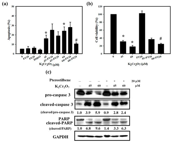 Pretreatment with PT rescued Cr(VI)-induced cytotoxicity. (a) HaCaT cells were pretreated with 10 or 20 μM PT for 1 h. Early apoptosis, detected using an Annexin V apoptosis detection kit, showed that PT (20 μM) inhibited Cr(VI)-induced apoptosis at different concentrations of Cr(VI) (45 and 60 μM) exposure for 24 h. (b) Cell viability was measured using MTT assay. HaCaT cells exposed to Cr(VI) for 24 h after pretreatment with 20 μM PT. PT slightly increased the cell viability of Cr(VI) (60 μM). Data are presented as the mean ± SD from three independent experiments. * p <0.05 versus control; # p <0.05 versus the Cr(VI)-treated group. (c) The expression of apoptosis proteins, pro-caspase 3, cleaved-caspase 3, PARP and GAPDH were monitored after 24 h of Cr(VI) or Cr(VI) plus PT exposure in HaCaT cells. Western blots are representative of n = 3 experiments.